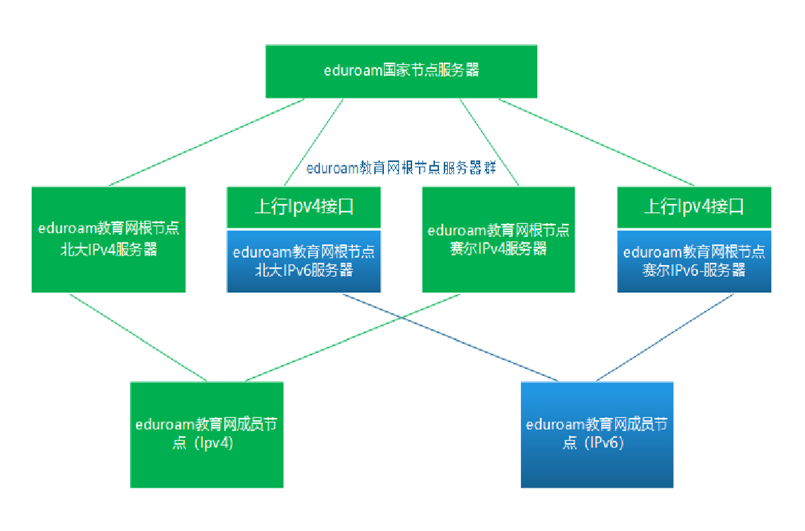 异地双栈、双核心服务上线后,eduroam 教育网成员可以选择 IPv4 接入或 IPv6 接 入,任何一种接入方式均可同时上连到北京大学机房和赛尔公司北京机房。