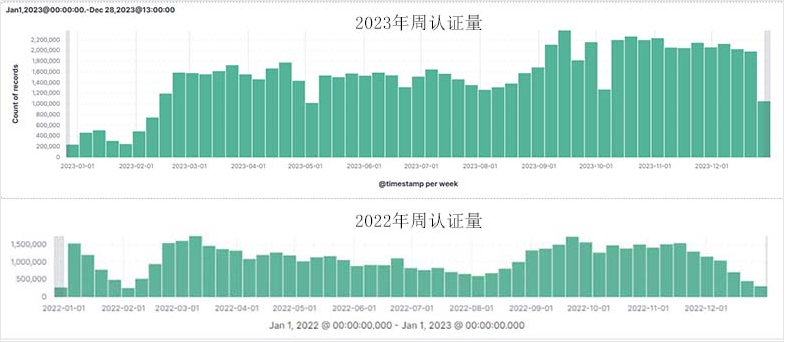 随着疫情后人员流动的增加,周认证量相比去年显著增长。去年周认证量约在100-150万左右,今年增加到160-220万左右。和往年情况类似,寒暑假、法定假日期间认证量有所下降。